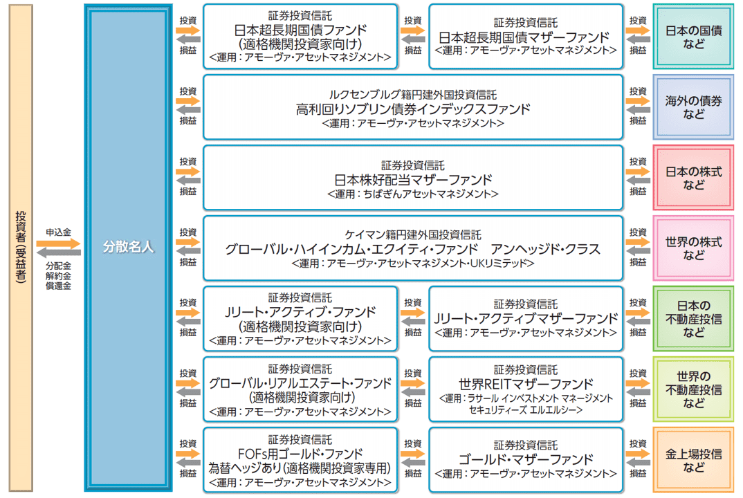 投資者の皆様からお預かりした資金を、直接株式や債券といった資産に投資するのではなく、株式や債券等に投資している複数の投資信託に投資して運用を行う仕組みです。